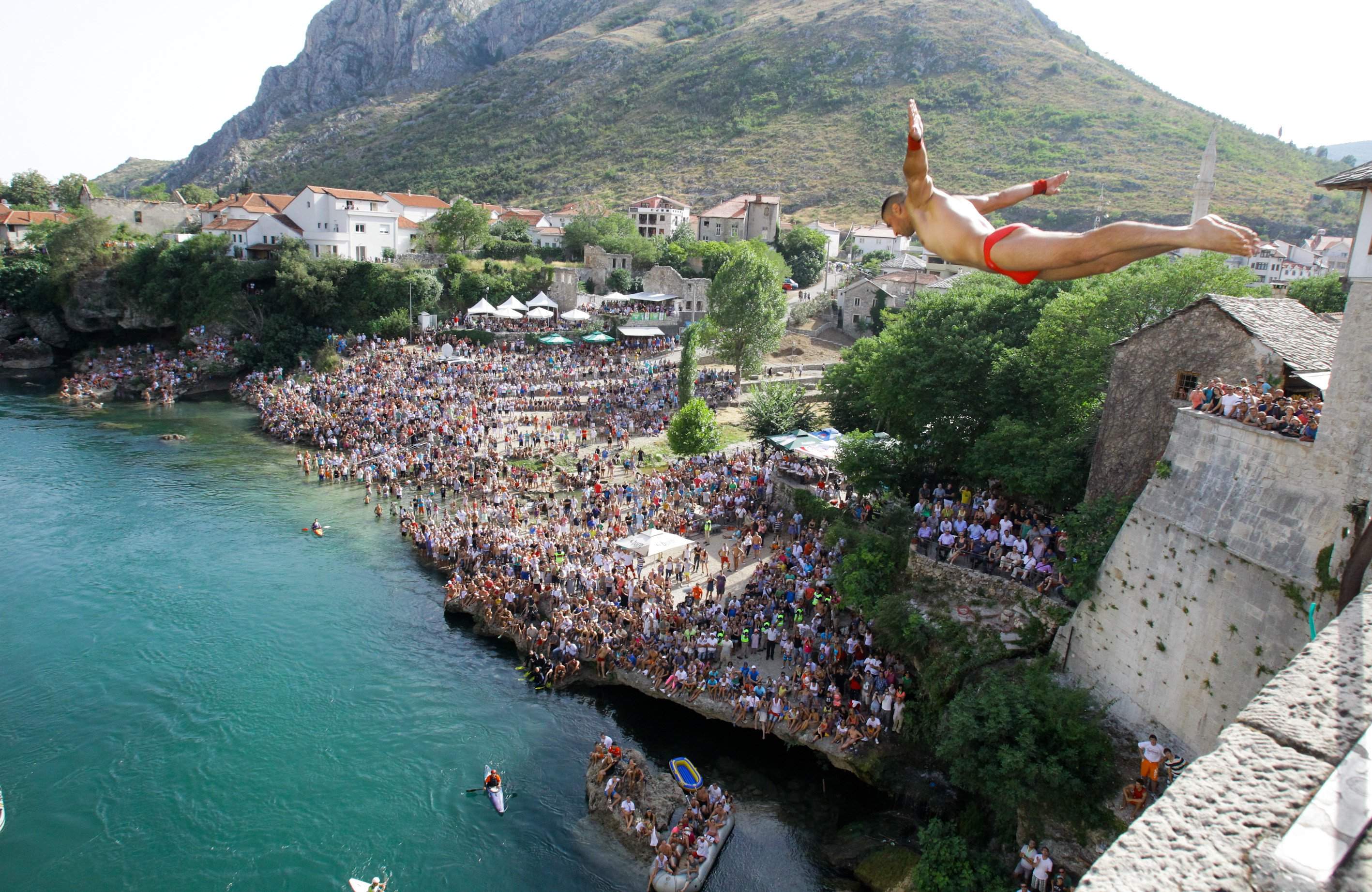 U vrijeme dok nije bilo Starog mosta, hrabri mladići su skakali sa obalnih pećina korita Neretve. Na gotovo svakoj plaži postojale su visoke pećine sa kojih bi se takmičilo a najuspješniji bi postajao uzor mlađoj djeci. Nakon izgradnje Carinskog, Lučkog i mosta na Musali počinje skakanje i sa tih mostova. Izazovi su veliki te pojedinci skaču čak sa kule i čardaka uz Stari most i uzvodno sa svih mostova što je predstavljalo veliku opasnost. Za vrijeme ratova mnogi Mostarci spasili su se upravo zato što su bili bili dobri skakači i spas pred neprijateljem su potražili skačući u Neretvu. Ilustrativan primjer je dr. Feodora Lukača koji se spasio skačući u Neretvu sa mosta na Musali.